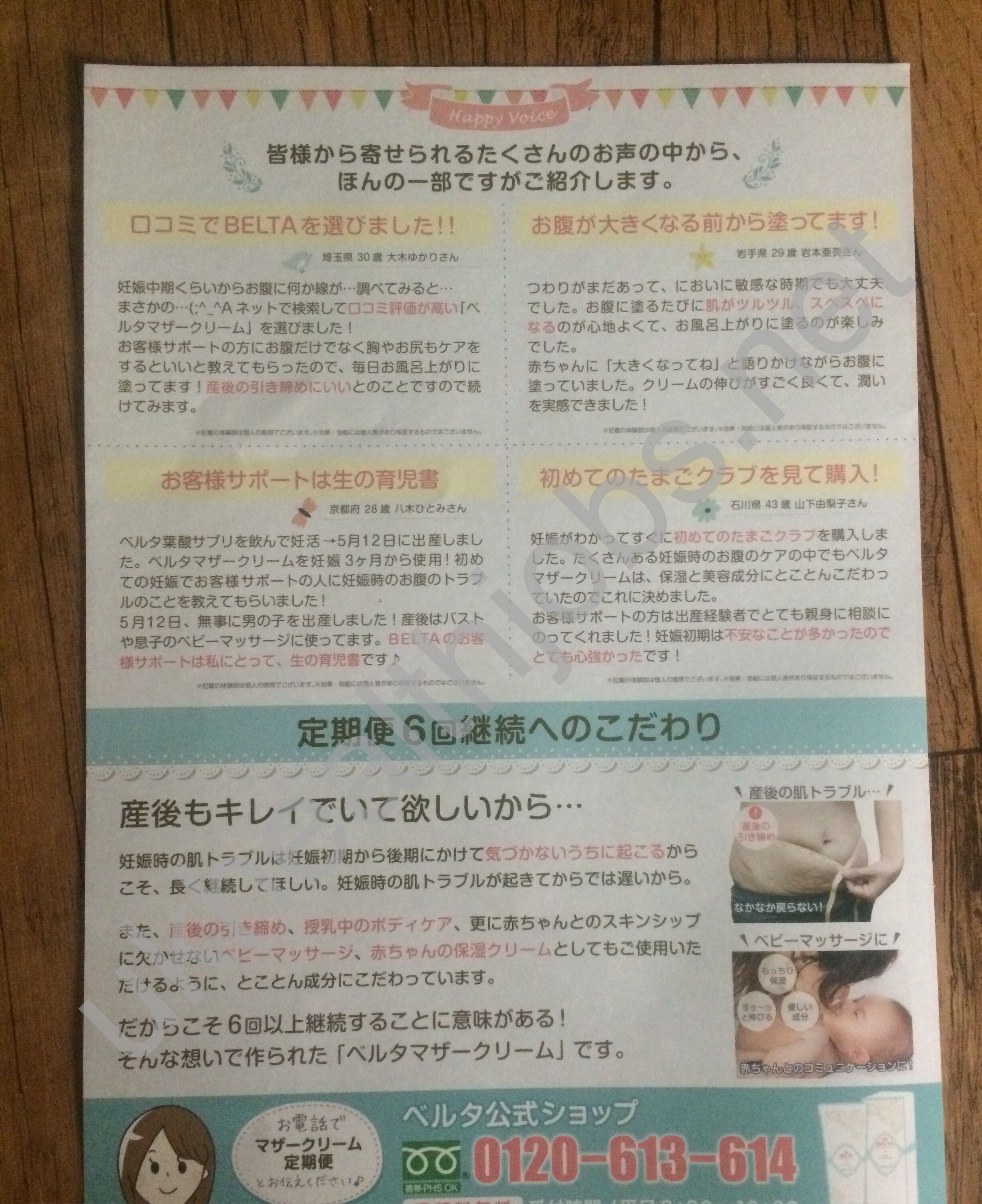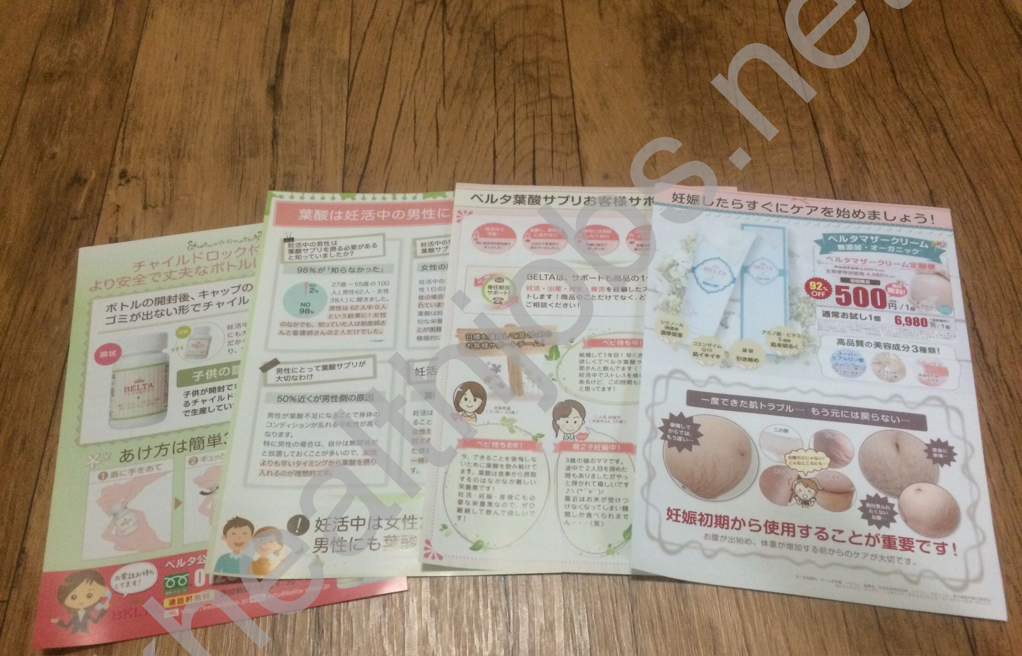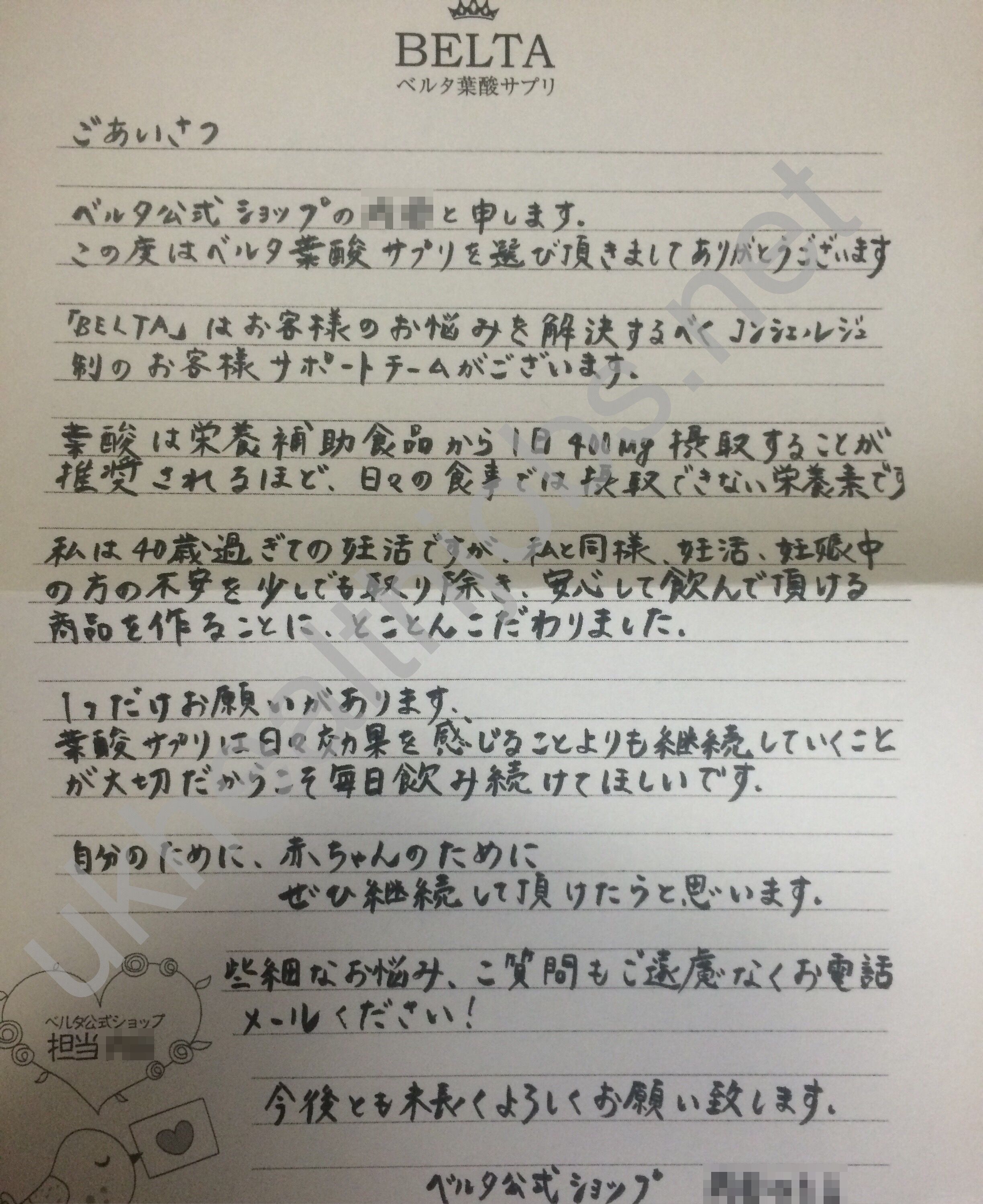 ベルタ葉酸サプリの説明、お客様の体験や感想、スタッフさんからの手紙(コピー)等が入っていました。